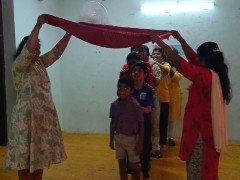 Teachers held the dupatta at a height and children went inside it.Music was played and children have to go under the dupatta.When the music was stopped randomly the child who was under the dupatta was caught and went out of the game.